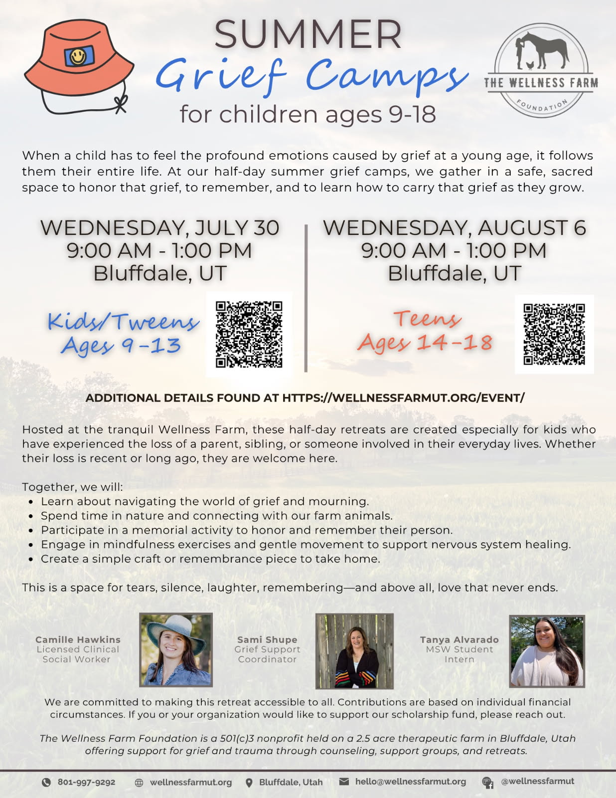 We are committed to making this retreat accessible to all. Contributions are based on individual financial circumstances. If you or your organization would like to support our scholarship fund, please reach out. The Wellness Farm Foundation is a 501(c)3 nonprofit held on a 2.5 acre therapeutic farm in Bluffdale, Utah offering support for grief and trauma through counseling, support groups, and retreats. |