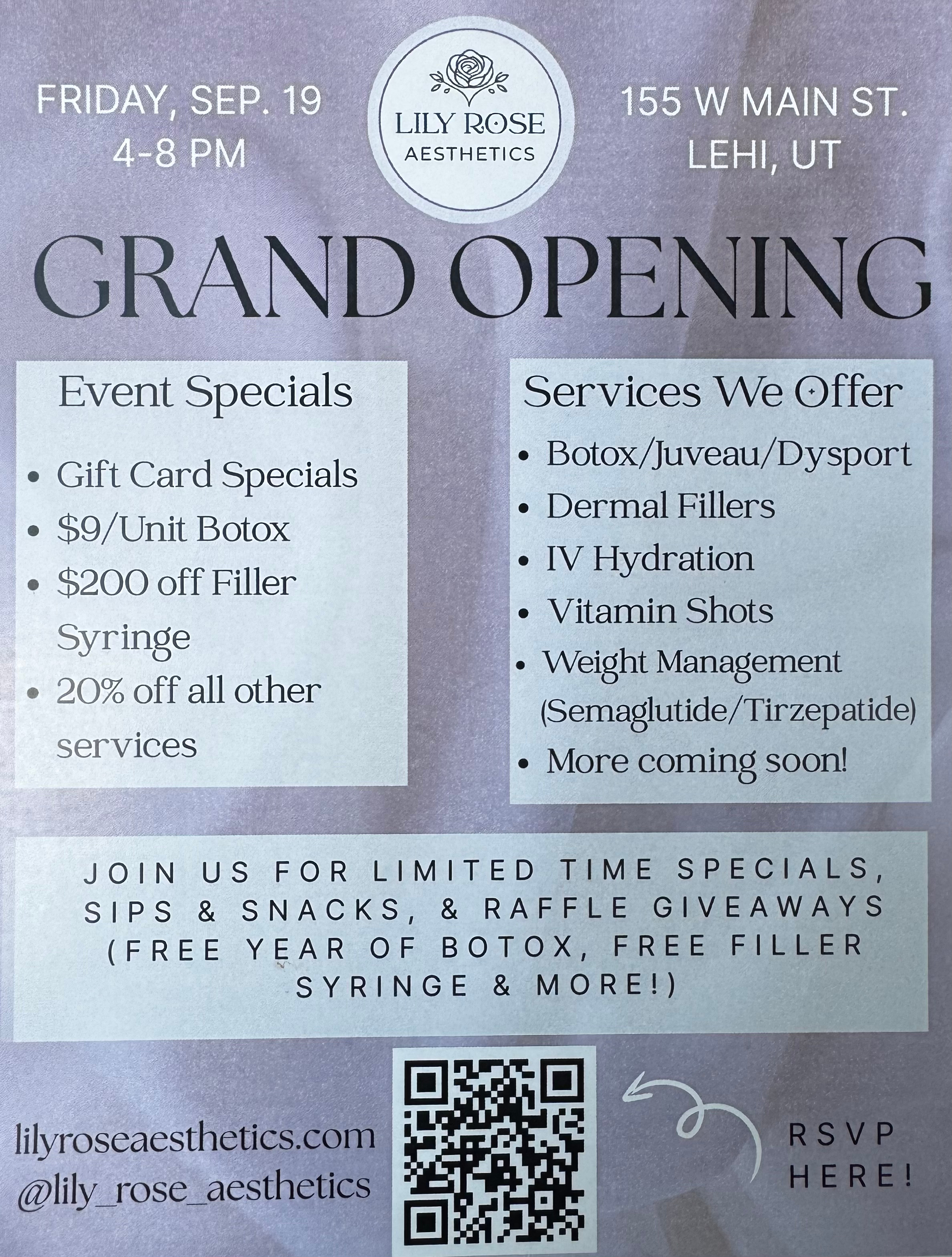 Come celebrate with us at the grand opening of Lily Rose Aesthetics! Join us for an exciting evening filled with delicious food, refreshing drinks, and a variety of exclusive vendors showcasing their best products. Experience the beauty and wellness services that make our med spa unique, and don’t miss your chance to win fantastic giveaways throughout the event. Come indulge in relaxation, rejuvenation, and community fun as we welcome you to Lily Rose Aesthetics—your new destination for radiant confidence!