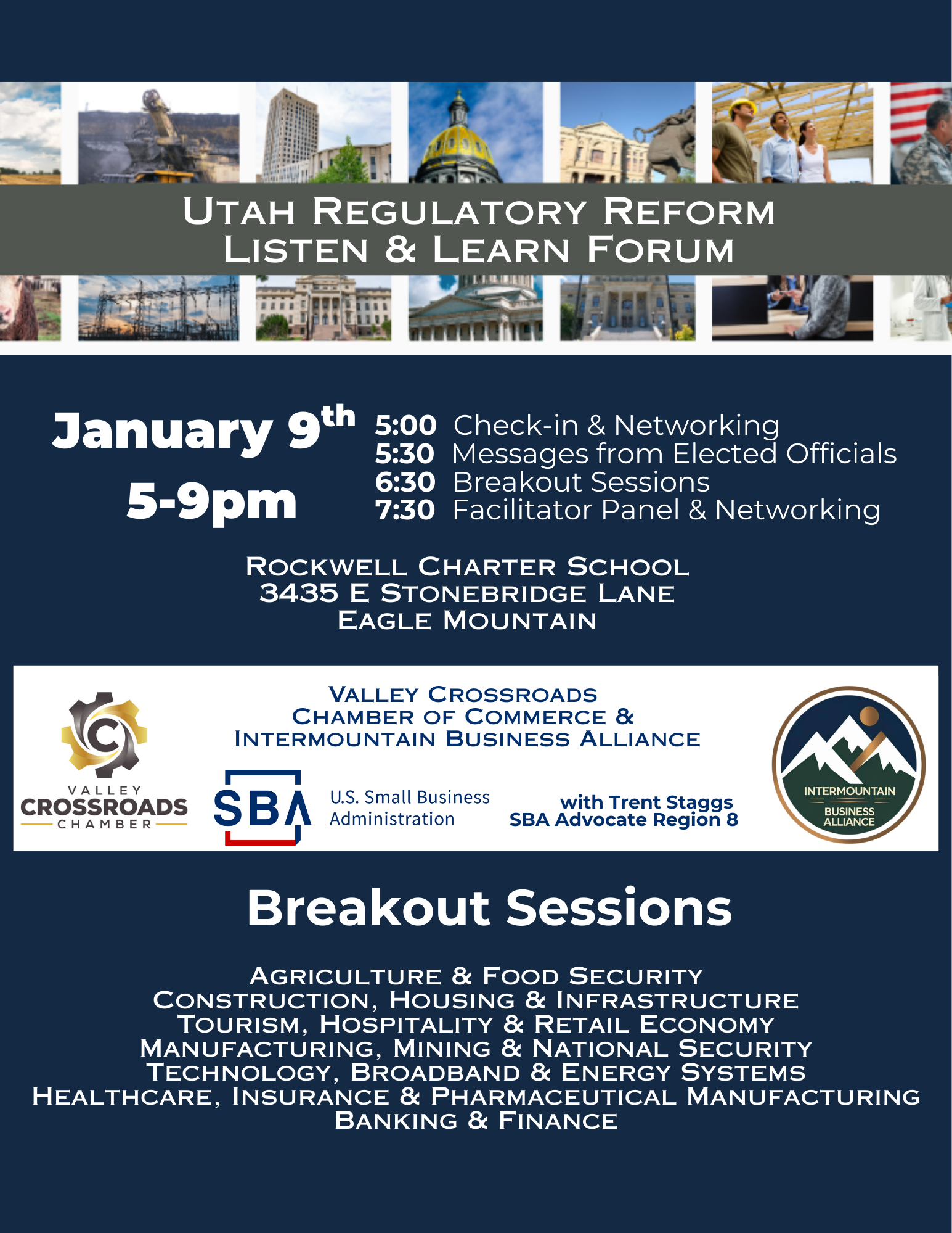 Hosted by the Intermountain Business Alliance in partnership with the Valley Crossroads Chamber of Commerce and the U.S. Small Business Administration, this forum brings together local, county, state, and federal officials alongside business owners and industry leaders to identify real-world regulatory challenges and develop practical, solutions-focused reforms that strengthen Utah’s business environment.